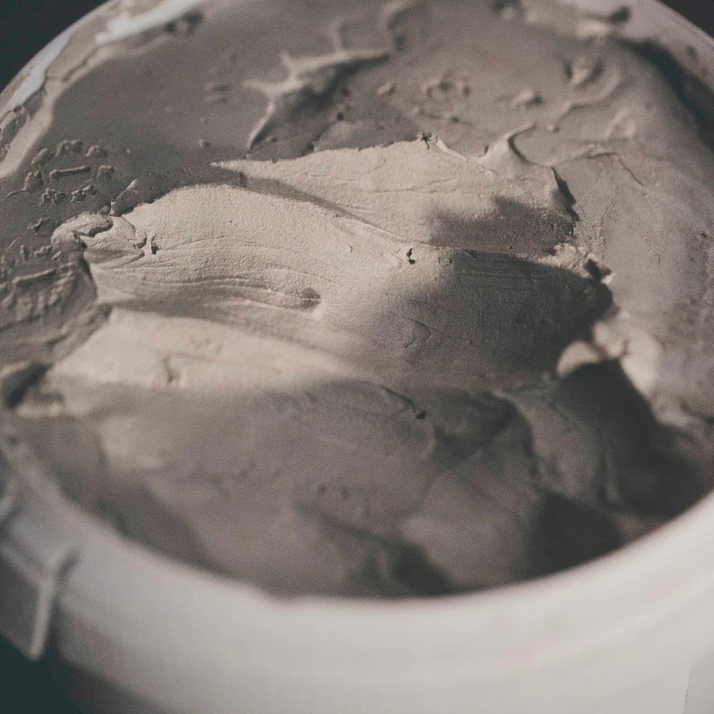 Argiles illite, kaolinite et montmorillonite 🟤, eau purifiée 💧, oxyde de zinc (non nano) ⚪, huiles essentielles de patchouli 🌿, myrte vert 🍃, tea tree 🌱 et géranium rosat 🌸.