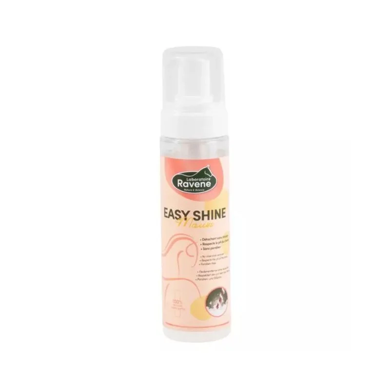 Ravene Easy Shine Mousse 🫧🐴 : nettoie les taches sans eau ni rinçage 💧❌. Formule respectant le pH de la peau, sans parabènes ni silicone 🌿. Enrichie en huiles essentielles, idéale pour un nettoyage rapide toute l’année ✨