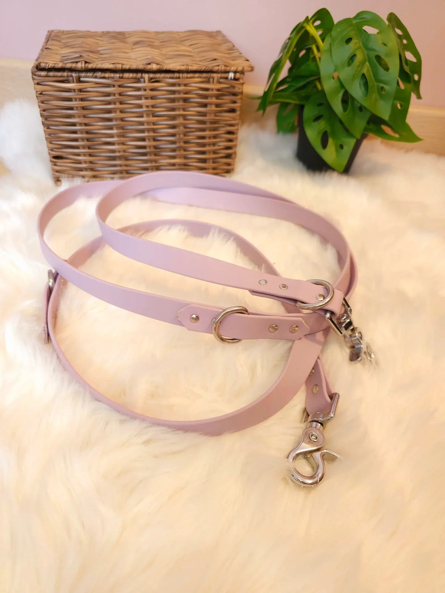 🐕 Laisse multi-positions en biothane 💜 Plusieurs usages : mains libres, courte, longue ou double attache 🔄 Résiste à l’eau 💧 facile à nettoyer 🧽 Longueur standard ajustable 📏 Personnalisation possible en magasin 🎨